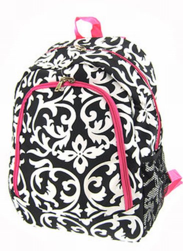 All around great bag for school, camping, overnight, files. Damask with hot pink accents. Large front pocket gives you even more storage.