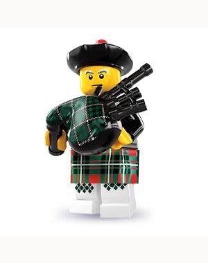 The Bagpiper is a Collectable Minifigure released in 2012 as one of the sixteen minifigures from 8831 Minifigures Series 7. He has leg printing of socks, a new Tam o' Shanter cap, a headpiece with serious expression and white eyebrows printed on it, a new kilt part, and a unique printed bagpipe piece.