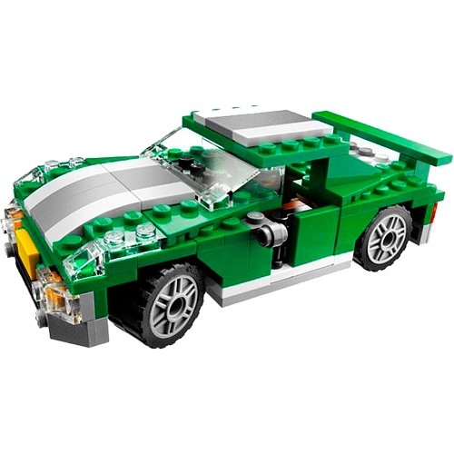 Three ways to cruise the city in style! 3 in 1! Hit the road in this sporty green street machine with opening doors. Then rebuild it into a cool hot rod or a lightning-fast racecar! Instructions included for all three models. Provides multiple building opportunities for beginner and intermediate builders alike! Vehicles have opening doors, loaded with details, and sporty green and white striping color scheme! Street car measures 6 (14cm) long by 3" (6cm) wide. This vehicle is not equipped with steering mechanism. Part of the LEGO Creator collection. Ages 6 yrs. +."