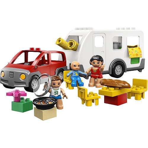 Includes 3 LEGO DUPLO figures: Mom, Dad, and baby Features 3 cloth sleeping bags, barbeque, 3 chairs, bread, flower and flower pot Caravan measures over 7" (17cm) long Car measures 5" (12cm) long.